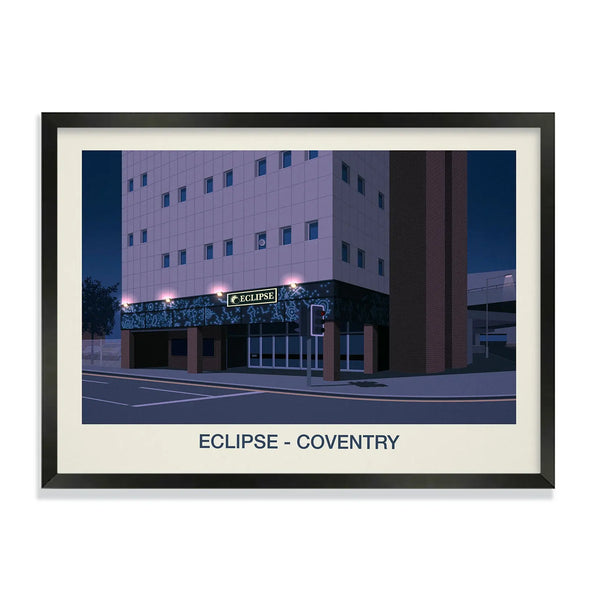 This poster features the legendary Eclipse nightclub from Coventry. The Eclipse was a former Granada Bingo Hall, when local entrepreneurs Stuart Reid and Barry Edwards put on the first club allnighter in October 1990. Unfortunately, the club closed its doors in Febuary 1994. This poster is part of a series of nightclub and venue prints from all your favourite dance and jazz clubs from around the world. With each piece printed on high-quality premium heavy-weight matte 200gsm paper and will arrive in a protective tube. Add a wonderful accent to your room or office with these brightly painted posters.